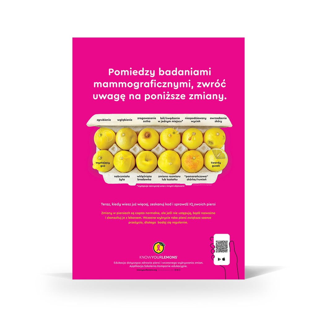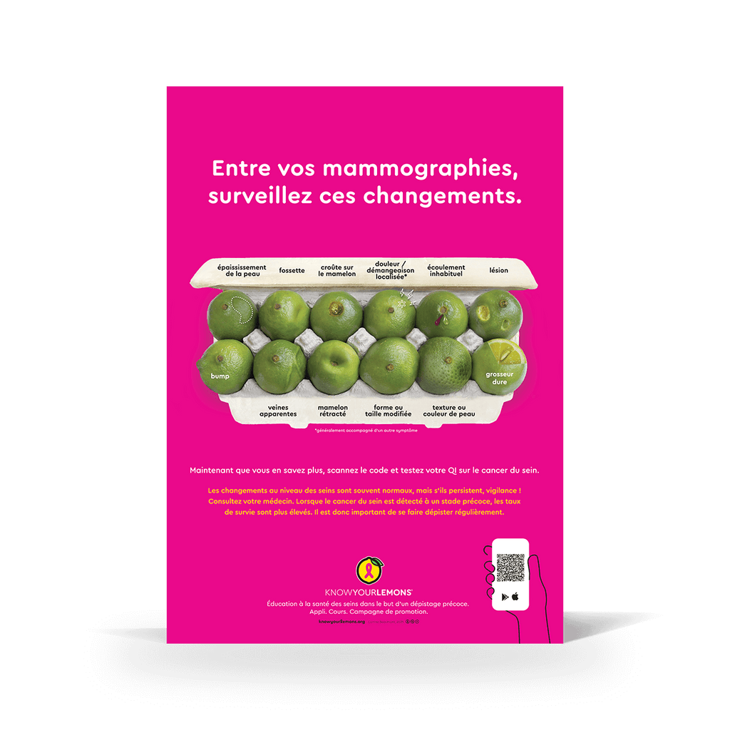 Educate about breast cancer awareness with our Know Your Lemons 12 breast cancer symptoms poster. Explain to patients, students and the public how a lump is just one of many breast changes to be aware of when it comes to improving early detection for breast cancer. Others include breast dimples, nipple changes, breast skin problems, what a breast cancer lump feels like, and more.