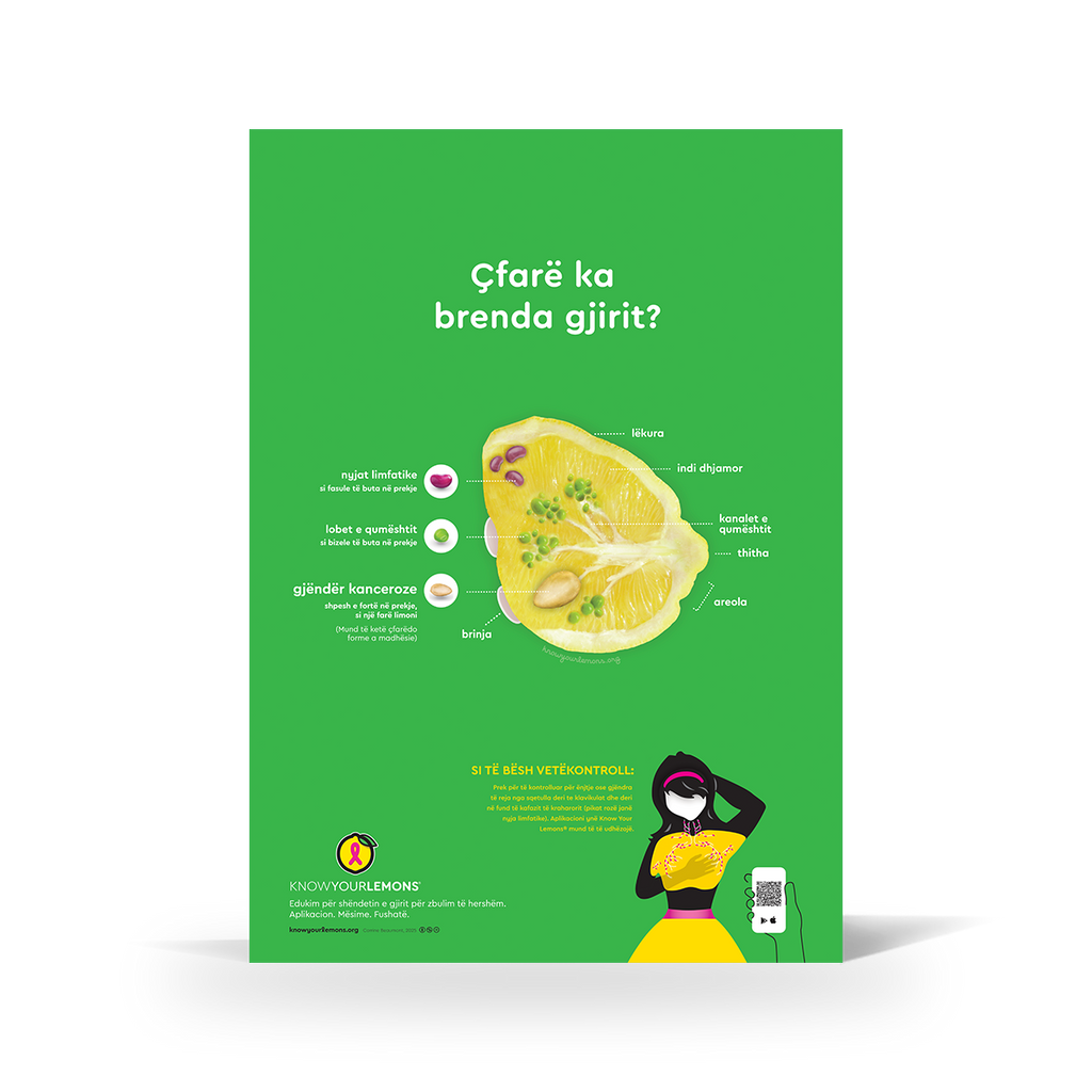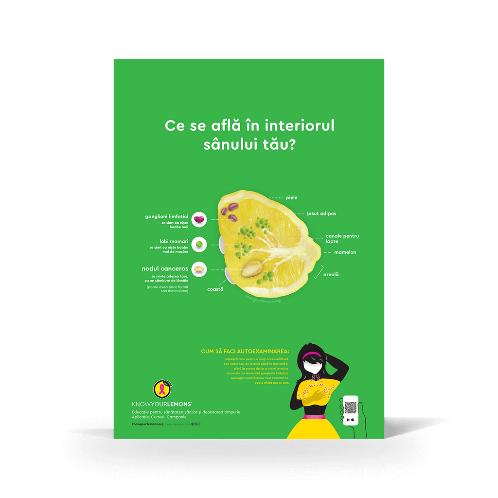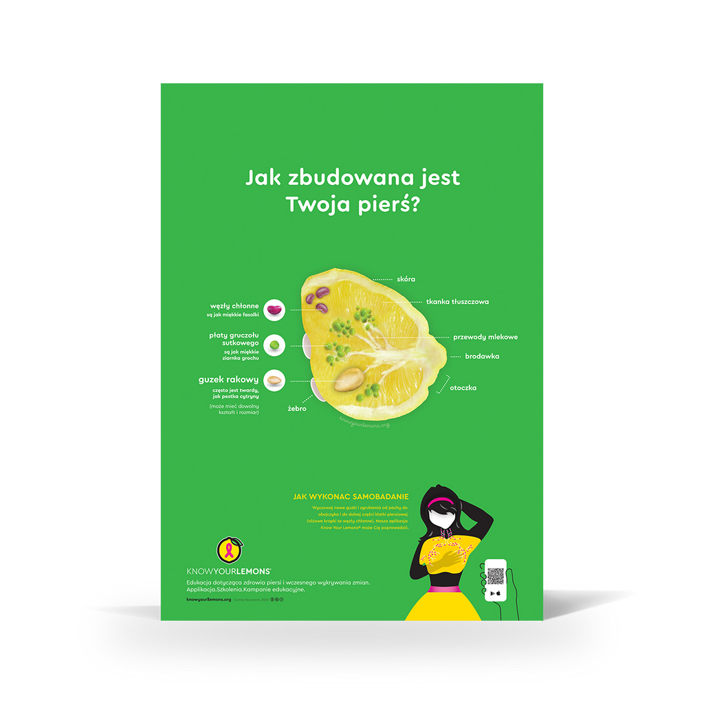 Educate about breast cancer awareness with our Know Your Lemons self-exam poster. Explain how self-exams (or breast checks) are an important part of early detection and breast health in a memorable and effective way by showing breast anatomy using the metaphor of a lemon.